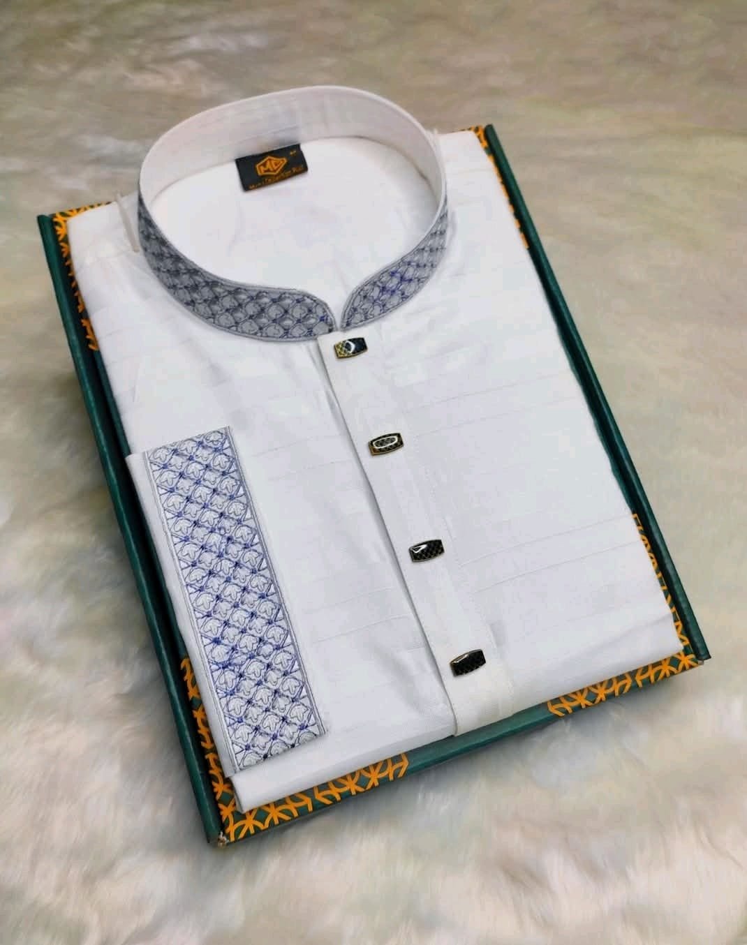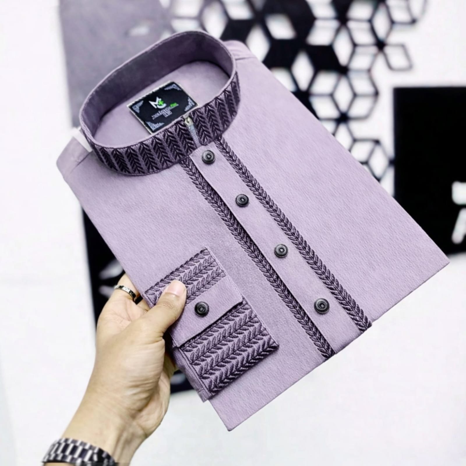 This unique light purple panjabi stands out with detailed embroidery on collar and cuffs, offering a stylish ethnic look.