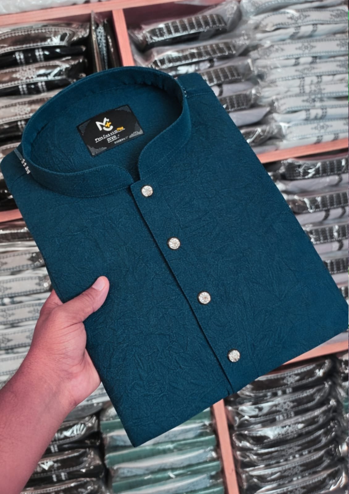 This elegant teal blue panjabi is crafted from high-quality textured fabric, offering both comfort and a premium look. The Chinese collar and metallic buttons add a modern yet traditional touch. Perfect for Eid, Jummah, or any special occasion.
